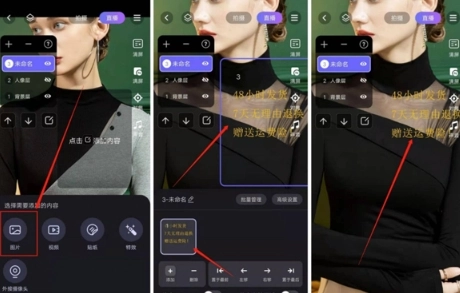 4、切换至人像图层,用双指缩放来调整人像的尺寸大小,长按并保持不松开手指能够拖动其位置,从而完成画面布局的设置以及人像的美颜处理。
