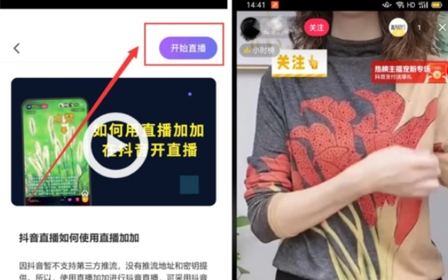3、进入直播间后,切换回直播加加应用,点击开始直播,用另一部手机观看即可。