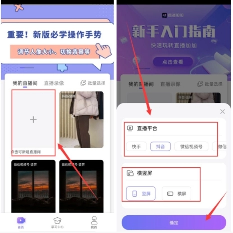 1、点击新建直播间,选择直播平台为抖音,画面设置为竖屏,随后确定并进入直播界面