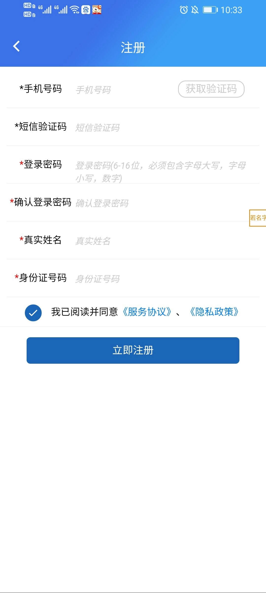 3.接着输入手机号码、姓名、身份证号码,再设置好密码,填写收到的手机验证码后,点击【立即注册】按钮。