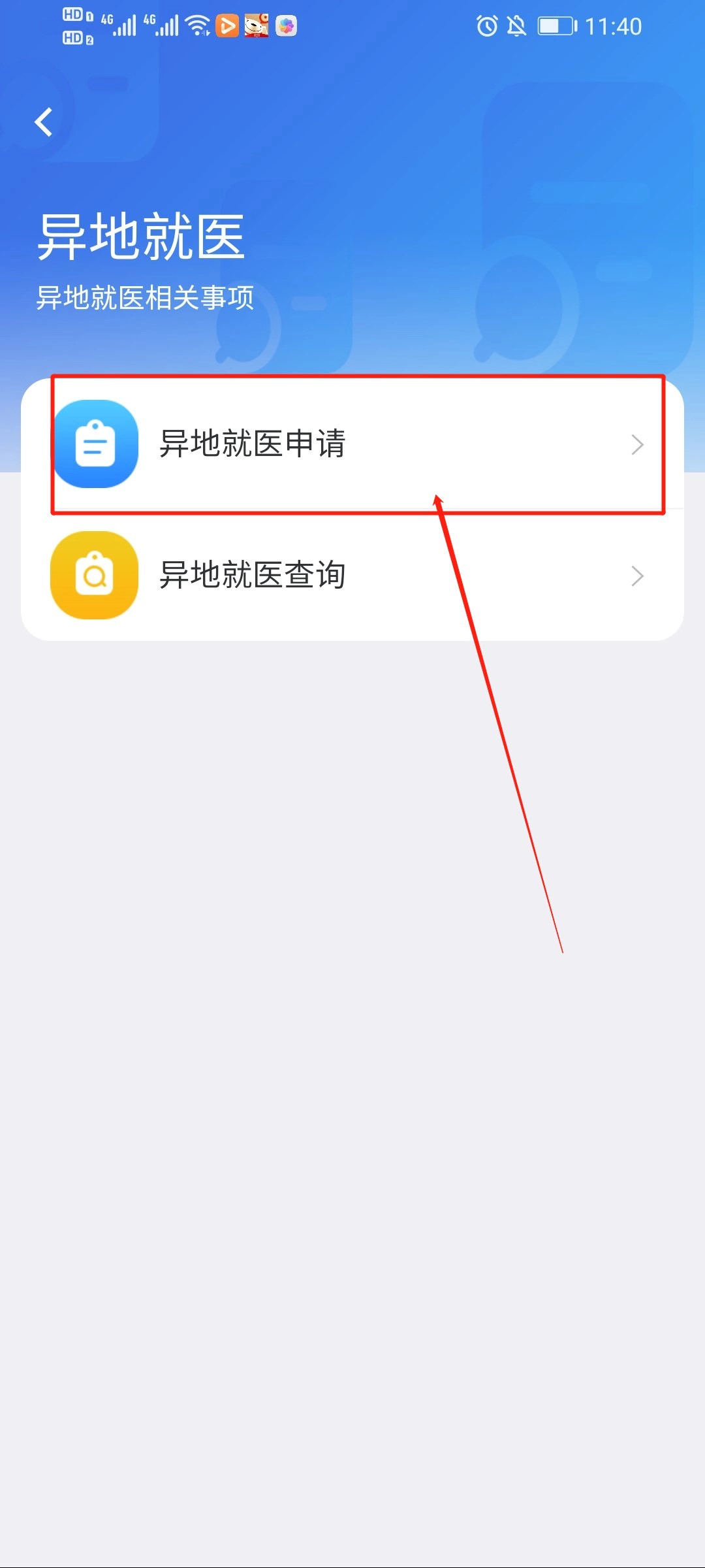 3.点击进入异地就医板块,然后点击“异地就医申请”选项(具体位置可参考下图)