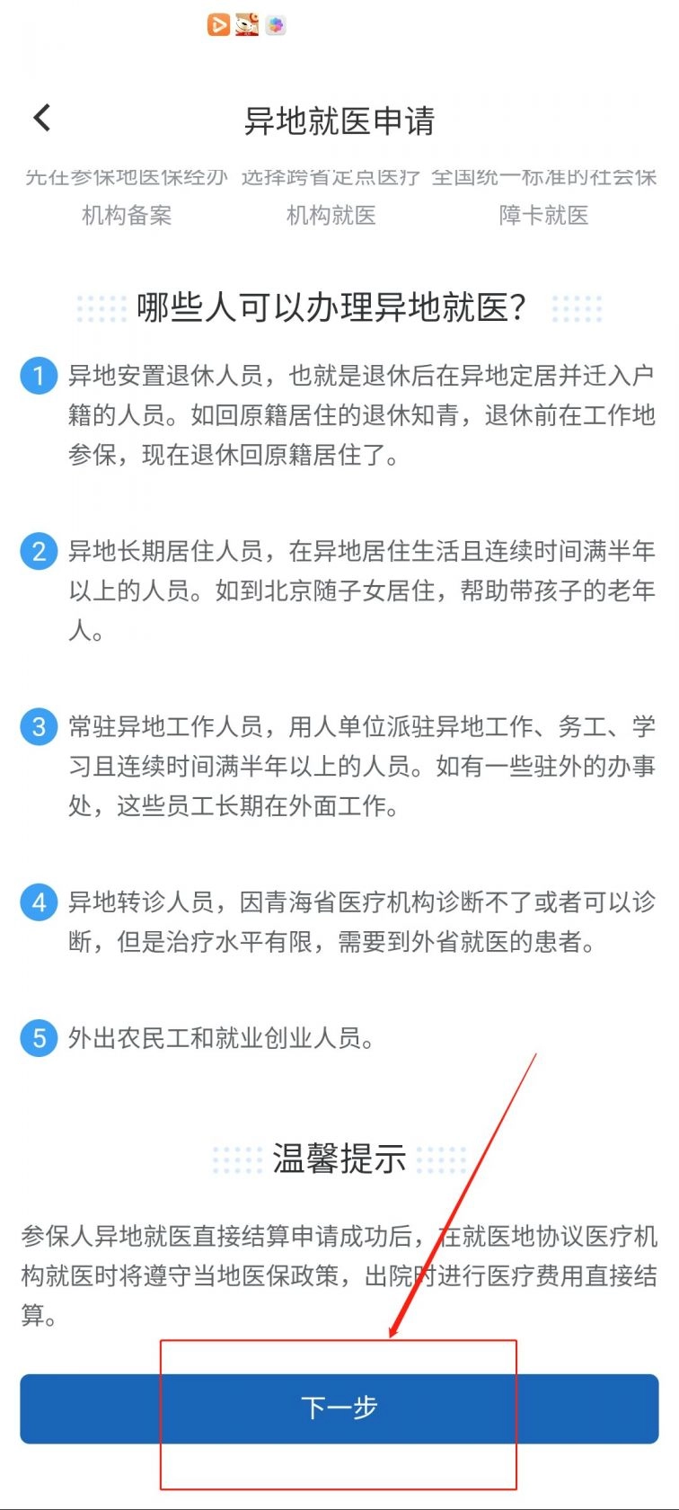 4.点击进入后,先阅读异地就医申请须知,接着点击“下一步”(操作界面可参考下图)