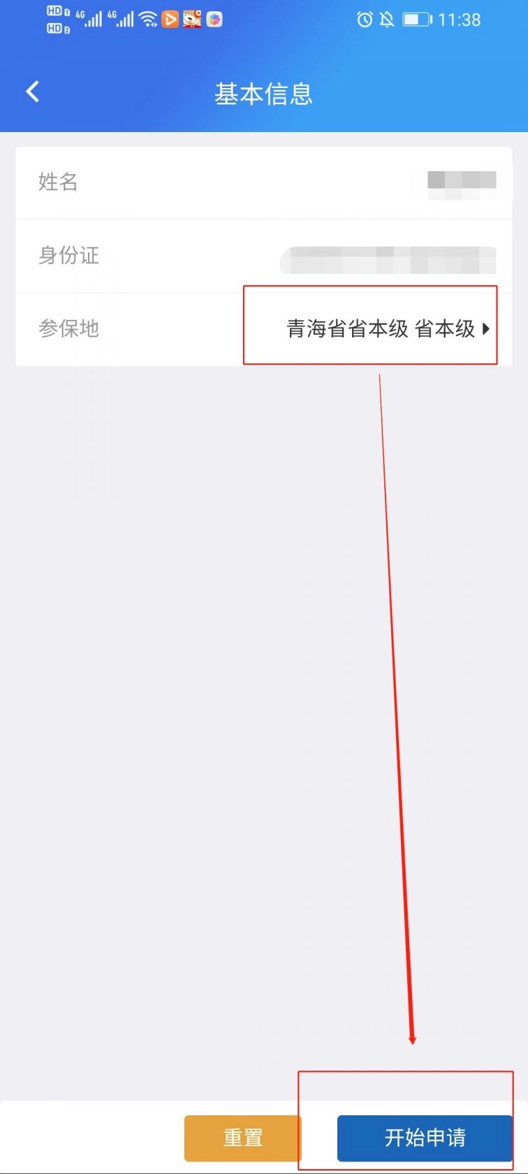 5.点击进入页面后,先查看个人基本信息,接着选择参保地,再点击“开始申请”,就能进入完善申请信息的环节了(如下图所示)