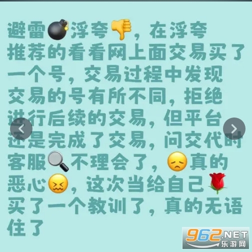 避雷浮夸!!!!!!在浮夸推荐的看看网交易买号,过程中发现账号和描述不符,我拒绝继续交易,可平台还是强行完成了交易。找客服要说法时,他们根本不理人,太恶心了。这次就当花钱买个教训吧,真是无语透了#游戏交易 #平台避雷