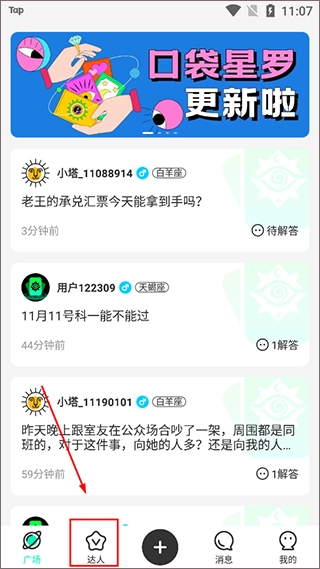 1、打开登录口袋星罗,点击下方的【达人】;