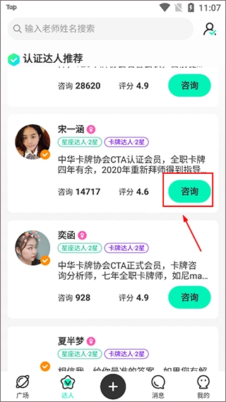 2、进入【达人】页面后,用户可依据自身希望了解的内容或有待解决的问题,挑选合适的达人开展咨询。