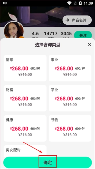 3、选好之后,进入达人的个人主页,点击页面下方的【咨询】按钮,接着选择要咨询的类目,再和对应的咨询师展开沟通。