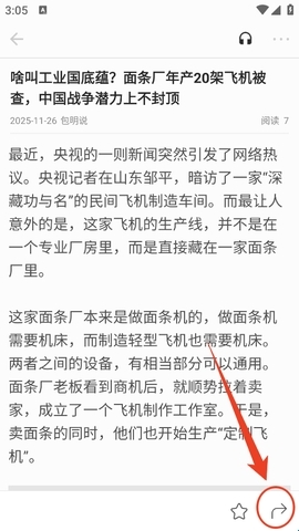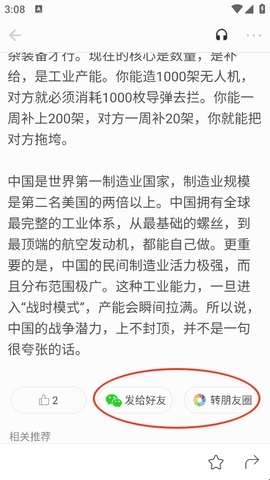 3、也可以直接翻到文章末尾,在那里同样能找到“微信分享”按钮,既可以选择发送给微信好友,也可以转发到微信朋友圈。
