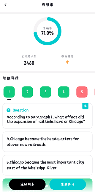 7、完成作答后,软件会自动进行评分,绿色标记代表回答正确,红色标记则表示回答错误,向下滑动页面即可查看错题的详细解析。