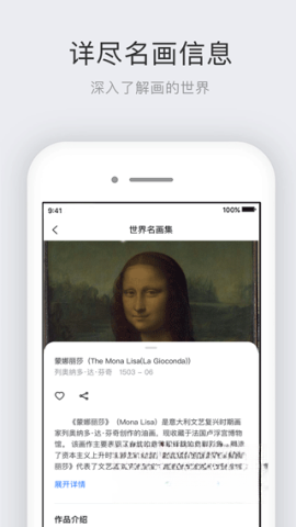 2、点击感兴趣的画作后,会进入详细页面,在此可以一键收藏心仪的作品,也能将画作信息分享到社交网络,便捷地与朋友分享美的体验。