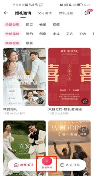 4、点击下方的“+”号就能创建请帖啦,里面有不少请帖模板,你可以按照自己的喜好来挑选哦。