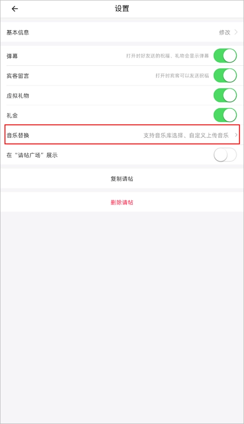 2、接下来在设置界面找到“音乐替换”选项,点击后就能进入音乐库,自行挑选想要的音乐了。