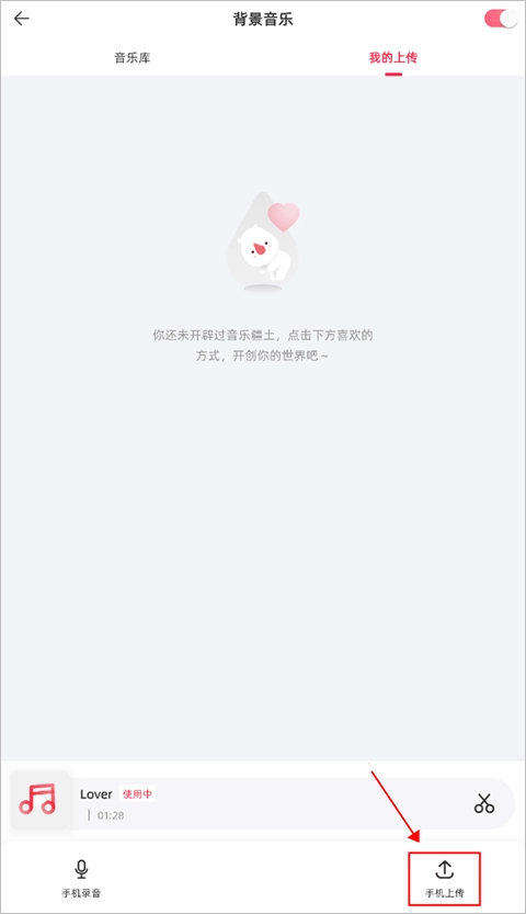 3、进入背景音乐界面后,点击“我的上传”选项,接着点击下方的“手机上传”按钮,就能导入自己喜爱的音乐了。