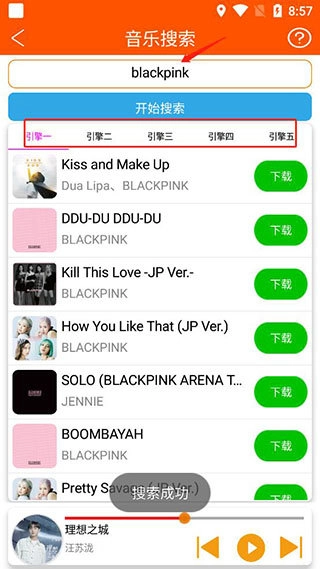 2、也能在搜索框里搜索歌手或歌名来播放,而且还提供了多个引擎的搜索结果;