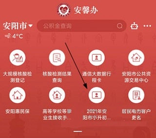 1、打开安馨办的首页,点击“2021年安阳市小升初电脑派位结果查询”这一选项。