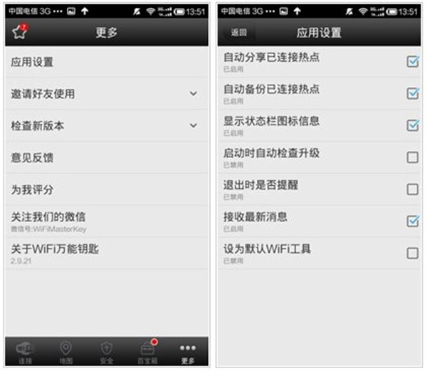 6、WiFi万能钥匙里的热点均由用户们共同分享,建议大家可在“更多”-“应用设置”中勾选“自动分享已连接热点”这一选项。