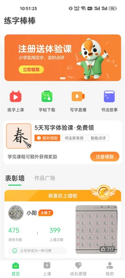 首页设有练字课程、字体库、写字直播、书法故事等实用功能模块。
