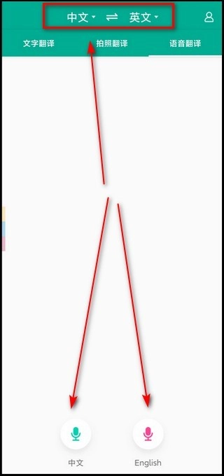 3、语音翻译:这里设有中文以及你指定的另一门语言,按住任意一个按钮讲话即可。