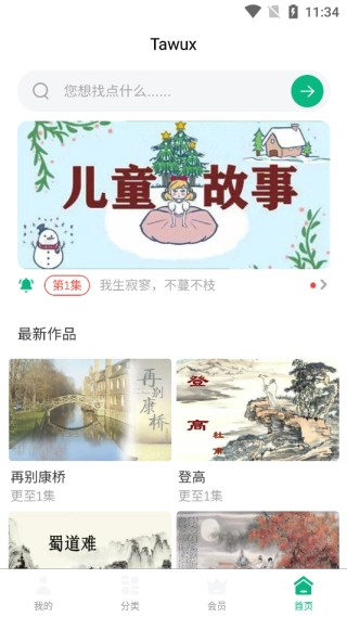 2、首页推送的故事以及诗词、书籍资源很丰富,随时在线播放。