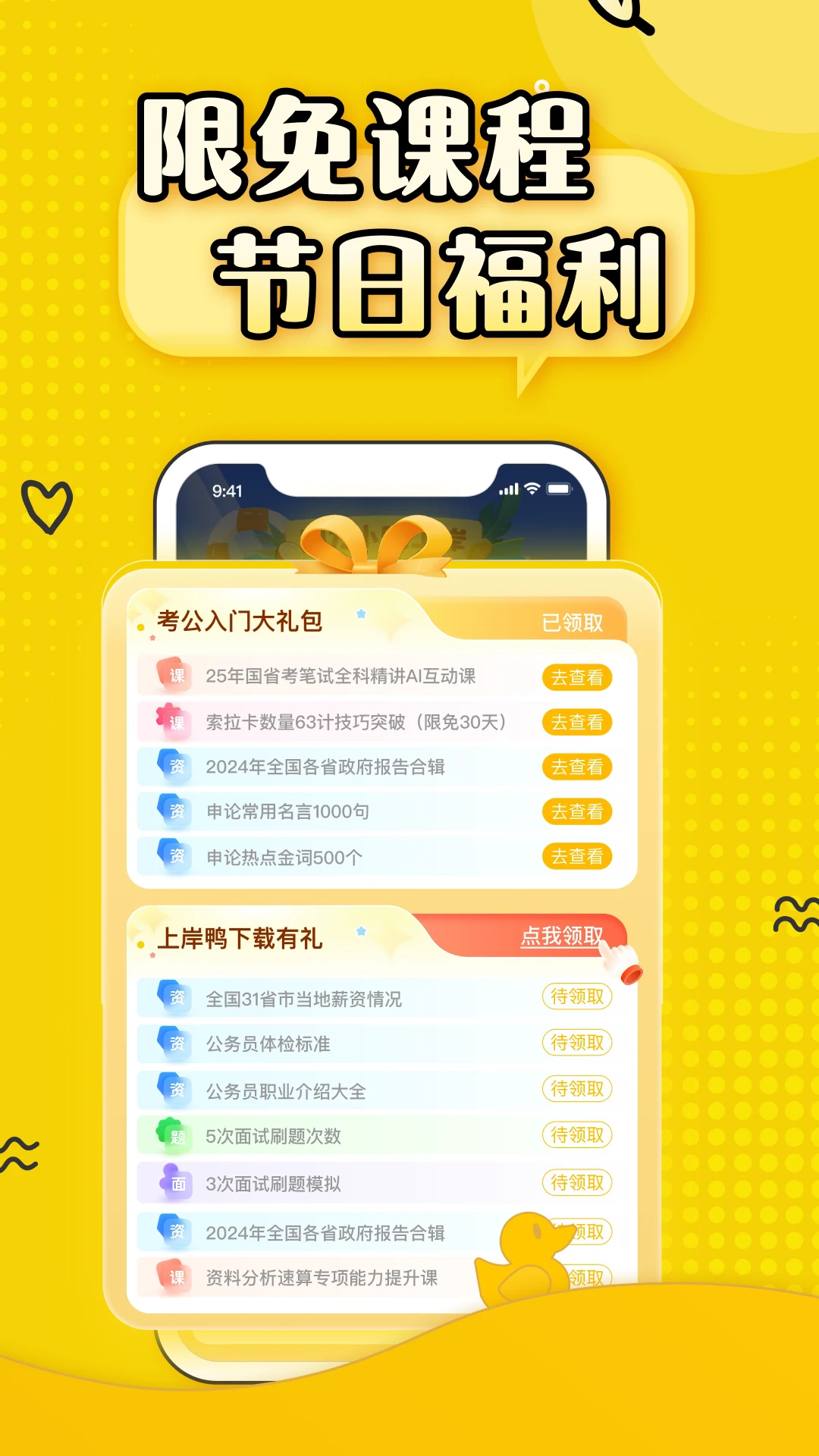 上岸鸭公考1.6.18是一款能让人轻松学习各类考公知识的教育应用,里面收录了历年的各类学习资料,还从不同领域整合了丰富的题目内容。它模拟了真实的笔试与面试题目,通过多维度的模拟训练,能让你充分认识到自身的不足之处,快来体验吧。