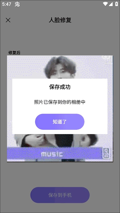 第四步,点击「保存到手机」按钮,修复完成的照片就会被保存到你的手机相册中了。