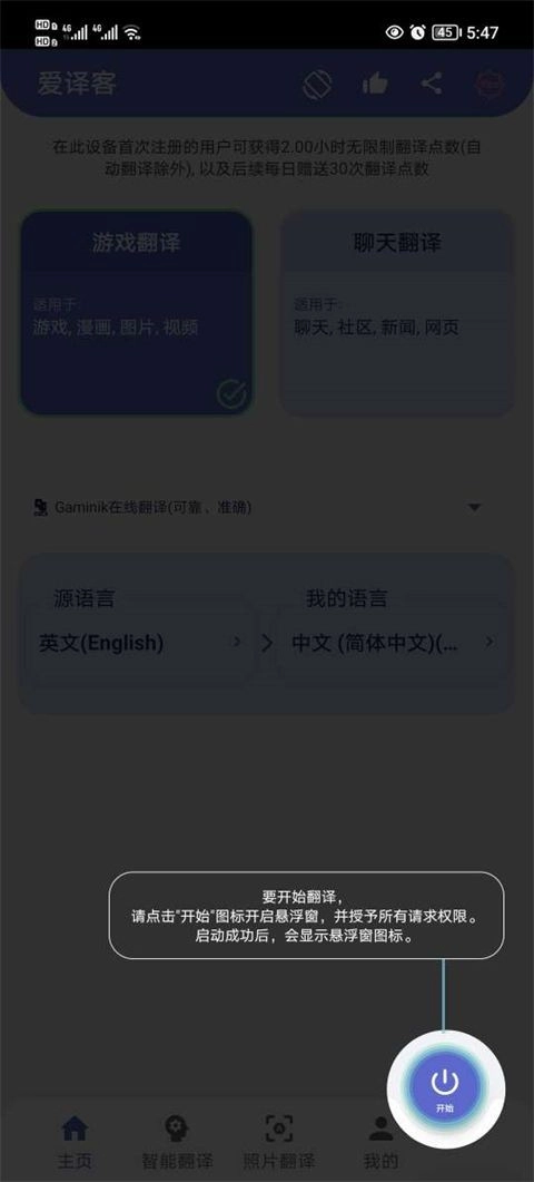 进入软件后,点击右下角的开始图标,开启相关权限。