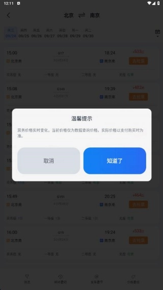3、支持去抢票功能,系统会带来票价变化提示,确定就可以抢票成功。