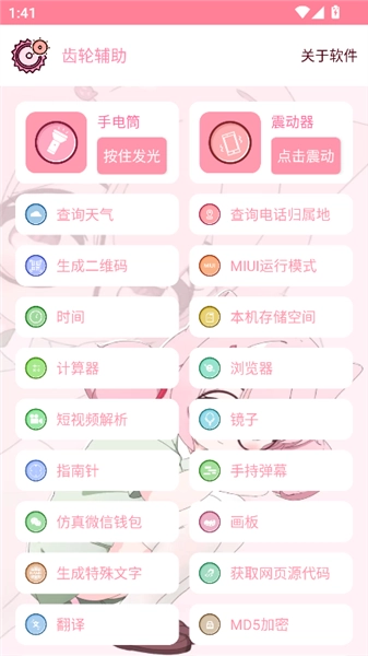 齿轮辅助羽霖咲华是一款多功能手机工具箱,集成了众多实用功能,像天气查询、二维码生成、计算器、浏览器、短视频解析、MD5加密等。此外,它还具备游戏辅助功能,适配多种游戏场景,支持用户自定义按键、调整灵敏度等,助力玩家更顺畅地操控角色,优化游戏操作体验。同时,该工具箱能实时监测游戏内的帧率、延迟等数据,从而让游戏运行更流畅。