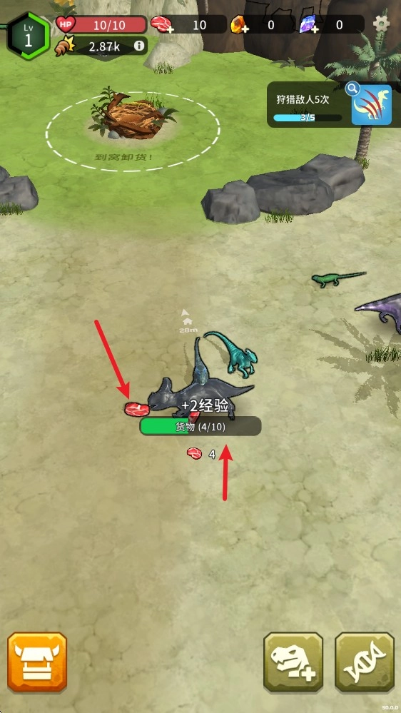 3、成功击杀猎物后会掉落食物,靠近就能拾取,同时界面下方会显示你的容量信息。