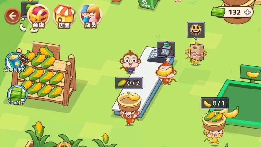 开个超市是一款萌系风格的经营类游戏。在游戏里,玩家将化身为森林超市的老板,操控一只圆滚滚的小猴子来打理超市里的香蕉专区。玩家需要根据顾客提出的需求,从货架上取下符合对应熟度要求的香蕉,并且快速完成称重和打包的操作。