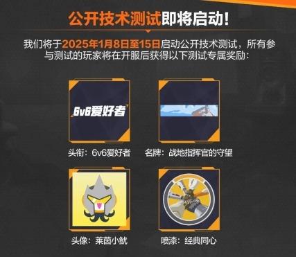 测试期间,服务器仅开放休闲比赛模式、6v6经典模式、训练靶场等部分游戏模式,同时禁用商业化功能。参与本次测试的玩家,在游戏正式开服后将获得【头衔】6v6爱好者、【名牌】战地指挥官的守望、【头像】莱茵小鱿、【喷漆】经典同心等外观类奖励。