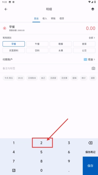 3、点击保存按钮,完成早餐支出的记账操作。