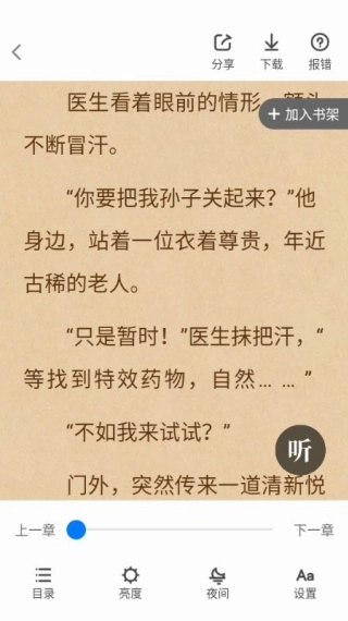 2、阅读功能完备且贴合用户需求,具备亮度调节、夜间模式、听书等实用功能,能够适配多样化的阅读场景,充分满足不同情况下的阅读需要。