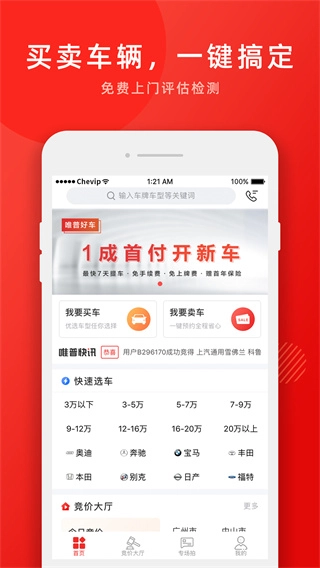唯车拍作为专业二手车拍卖平台,凭借竞价拍卖与车况查定相结合的一体化服务,为个人用户及车商打造安全可靠的交易场景。平台汇聚全国优质车源,精准对接车主与买家的核心需求,同时提供安全支付保障及手续代办服务。