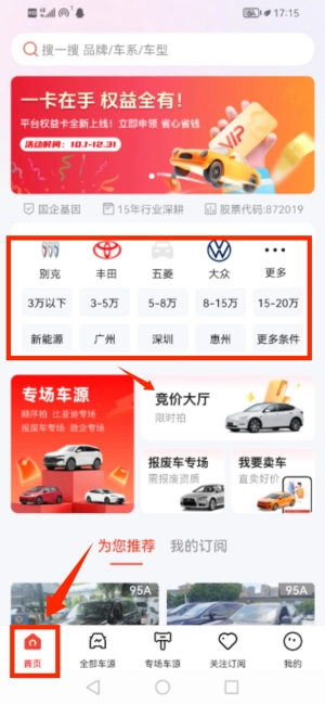 2、通过品牌或价格等条件筛选目标二手车。