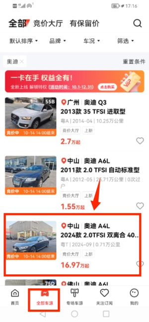 3、在全部车源列表中选择具体车型查看。