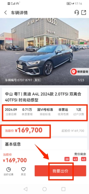 4、查看车辆详细信息后,可参与出价竞拍。