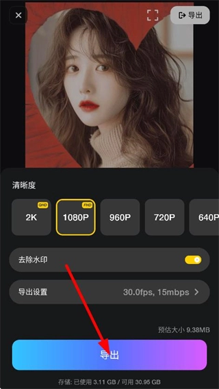 4、在导出设置页面,设置清晰度等参数后,点击导出,导出编辑好的内容。