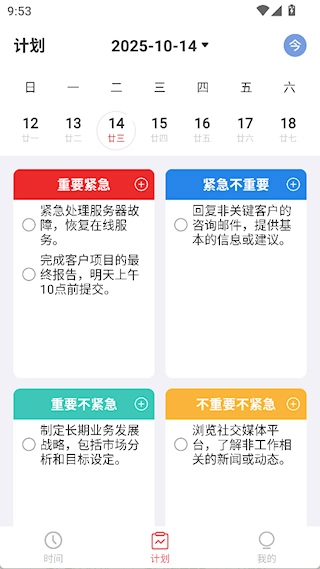 2、计划界面有日历和四象限视图