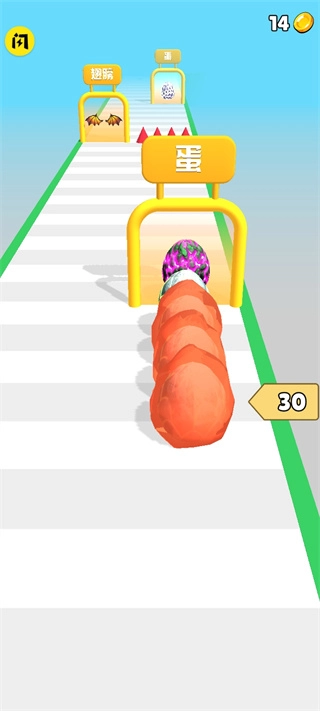 在丛林、火山等主题赛道上,障碍物会随机出现,玩家需要操控恐龙,在躲避陷阱机关的同时,及时吞噬同类完成合并。