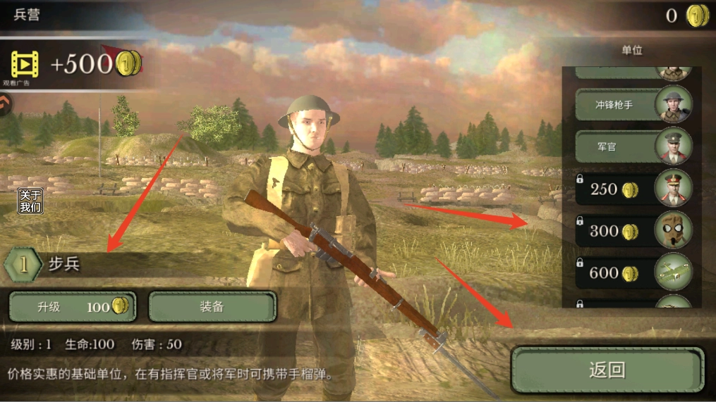 6、在兵营能进行兵种升级,还可解锁更多兵种,解锁所需金币通过战斗获取。