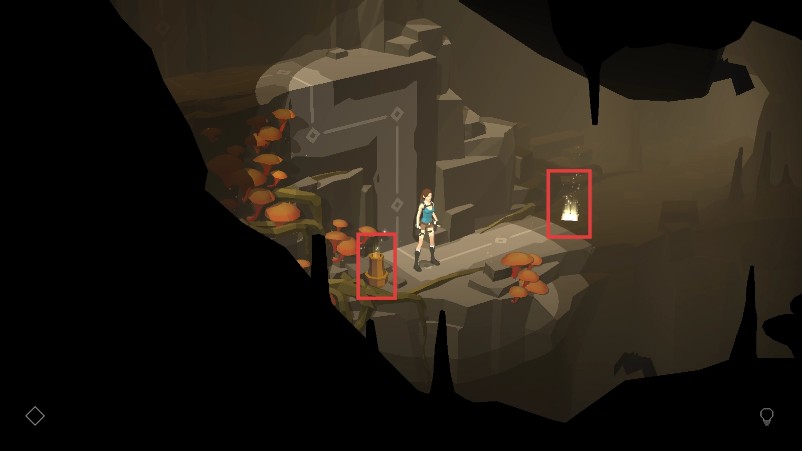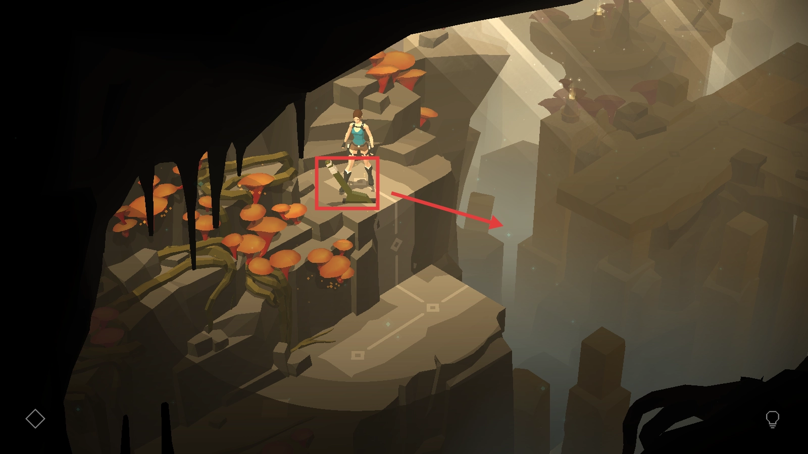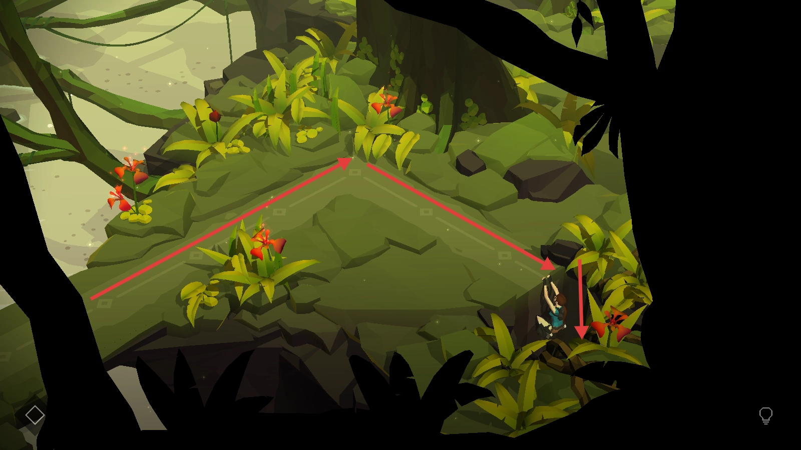 1、在丛林场景,跟着红色箭头指引,操控劳拉移动、攀爬,探索新区域,开启冒险吧。