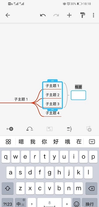 (选择一个子主题,点击这个按钮后,会出现如图的蓝色边框以及右边的“概要”,概要两字可以自行修改编辑)