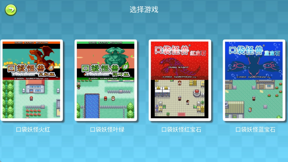 2、随后就能看到口袋妖怪绿宝石、口袋妖怪火红、口袋妖怪叶绿、口袋妖怪红宝石、口袋妖怪蓝宝石这五个版本,玩家可自行挑选进行游玩。