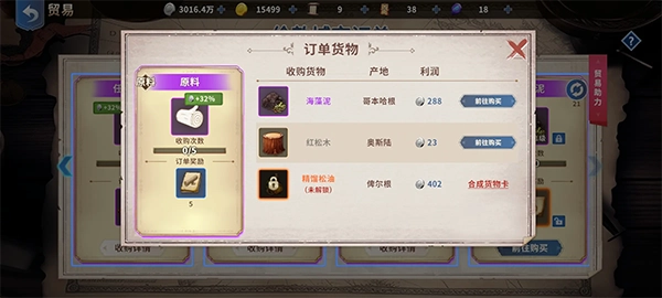 游戏里大部分货物的解锁存在前后置关联,得按顺序逐步解锁才行。所以在进行贸易前,务必确认【订单奖励】是不是合成下一个货物所需的材料。