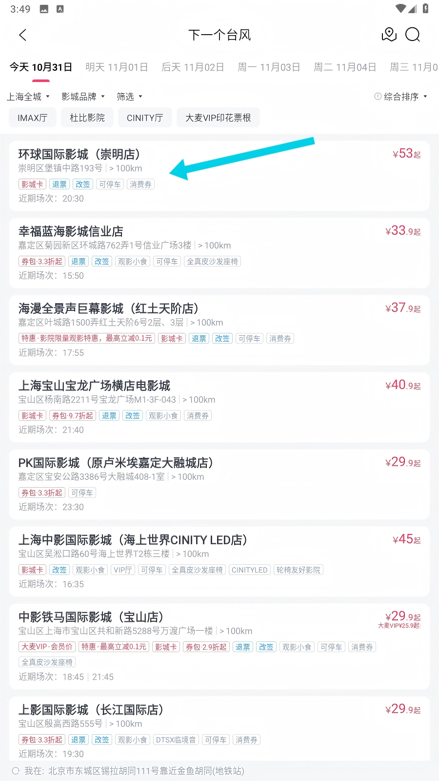 2、进入电影页面后,挑选合适的影院,比如【环球国际影城-崇明店】,点击进入选座环节。