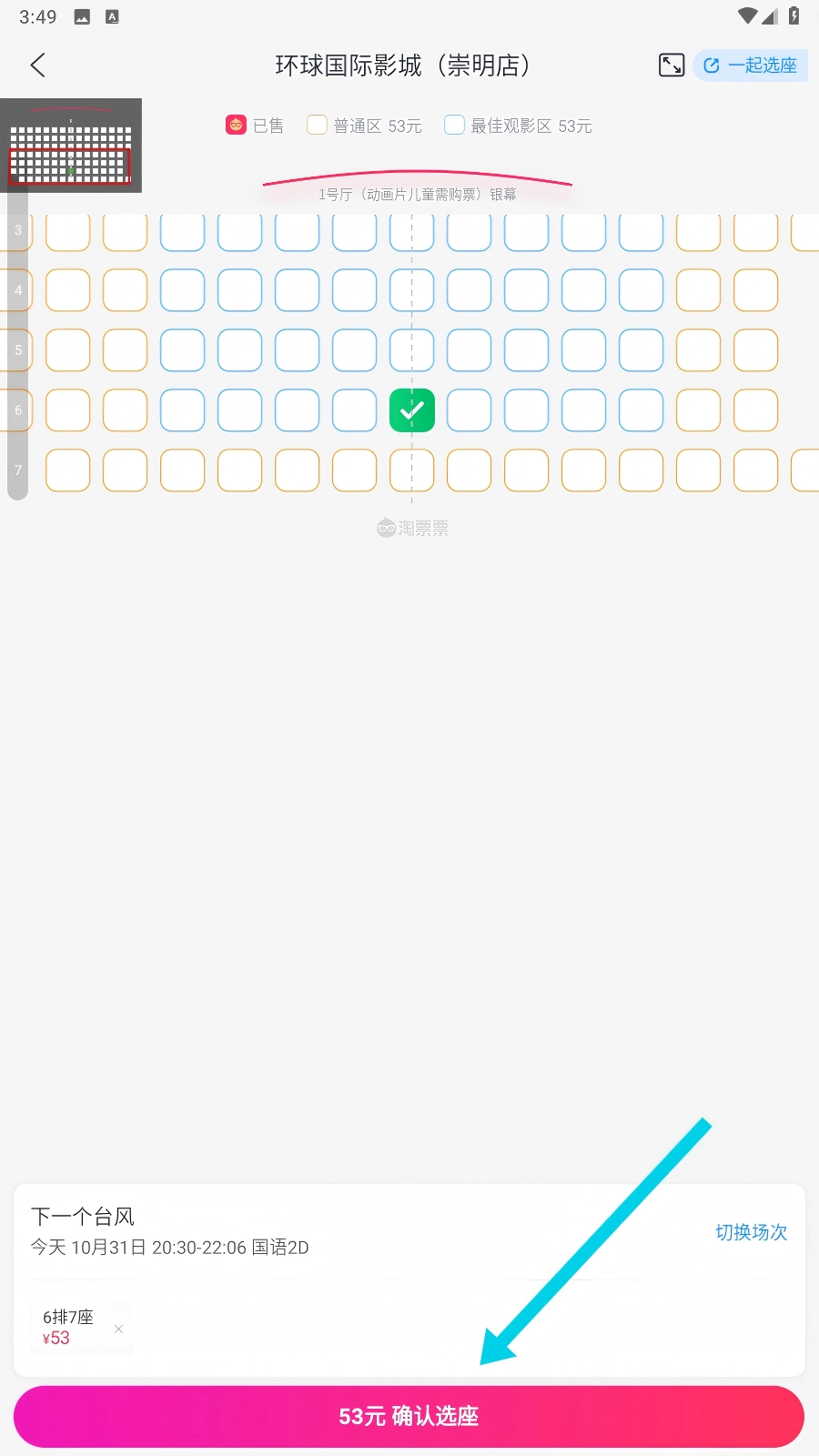 3、进入影院选座界面后,挑选你喜欢的座位,选好座位后点击【确认选座】按钮,就能进入订单流程了。
