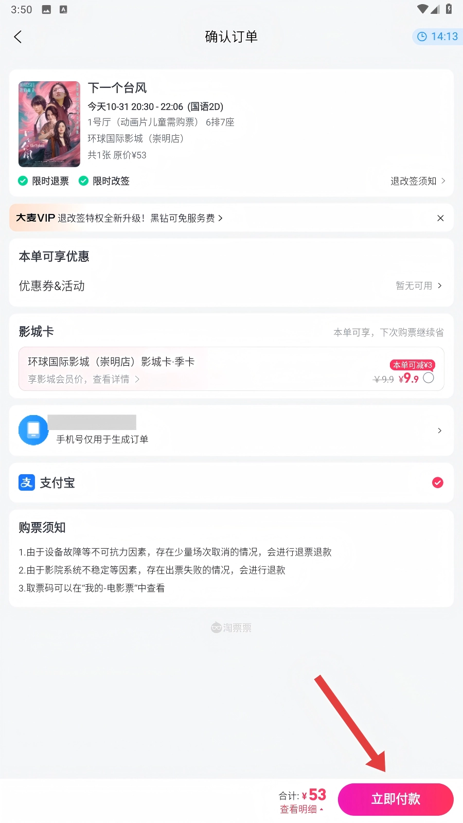4、进入确认订单页面后,仔细核对各项信息,确认无误后点击【立即付款】按钮完成支付,这样就成功购票,可以放心去看电影了。
