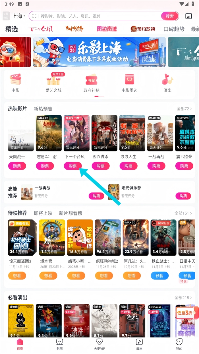 1、我们打开淘票票,在热映影片里挑选出想看的电影,比如《下一个台风》,接着点击【购票】按钮,就能启动买票的流程啦。