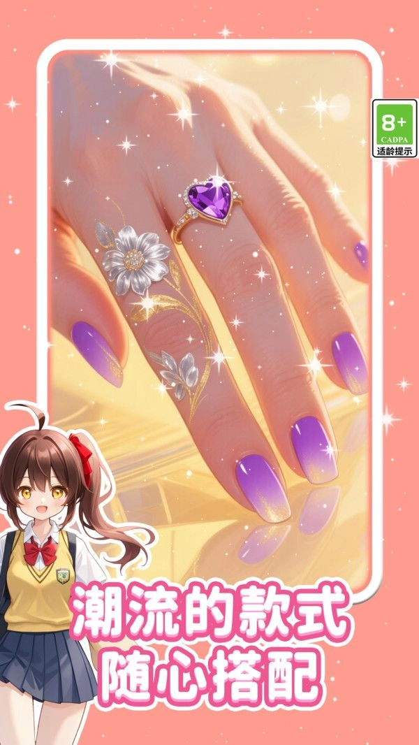 《炫彩解压美甲》是一款模拟美甲的游戏。在游戏里,玩家将化身美甲设计师,借助各类工具与材料,为虚拟顾客打造专属的个性化美甲造型。在尽情挥洒创意的过程中,玩家能充分领略美甲的独特魅力。凭借天马行空的想象力,玩家可以创作出独一无二的美甲作品,还能解锁各式各样的饰品,让美甲变得更加璀璨耀眼,极具吸引力。